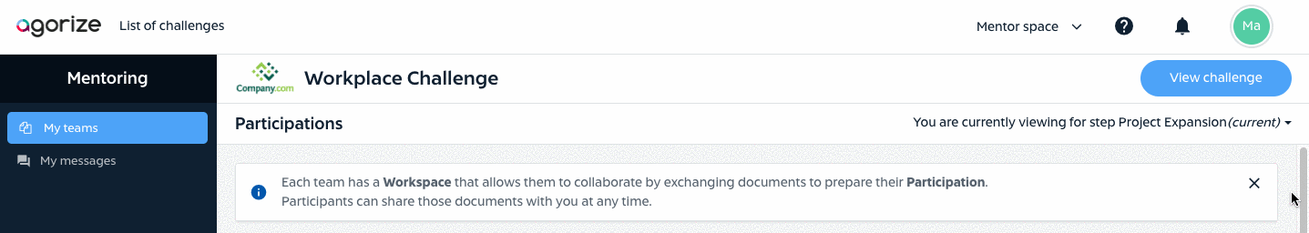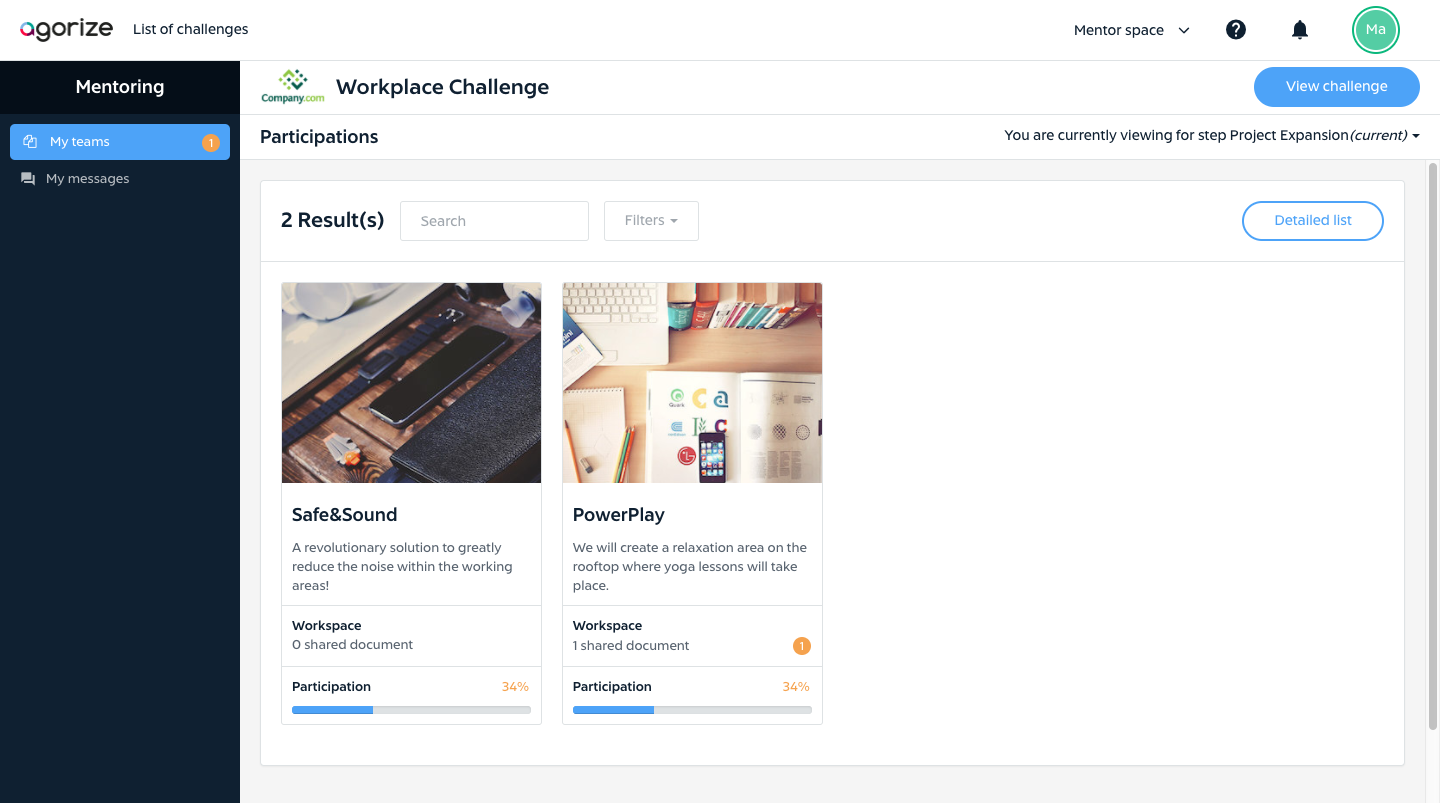 Utilisez la plateforme Agorize pour découvrir les dossiers des équipes que vous mentorez. Visionnez les fichiers qu'elles vous partagent et échangez avec elles.